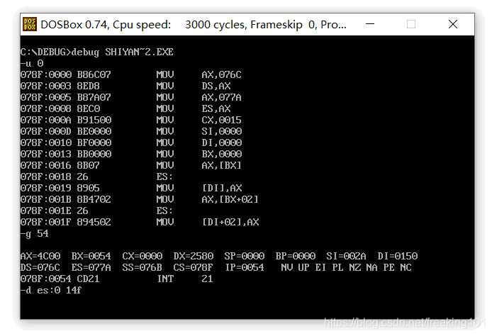 table endscodesg segmentstart:mov ax,datamov ds,ax;mov ax,table;mov es,axsub bx,bx ; mov bx,0sub di,di ; mov di,0mov cx,21;日期导入write_data:mov ax,ds:[di]mov ds:[bx+224],ax ; 224为从data段起始跳到table起始 add di,2 ; 日期为四个字节一组,而16位寄存器最大只能存两个字节,所以每次加二 mov ax,ds:[di] mov ds:[bx+226],ax add di,2 add bx,16 ;在table字段里换行输入日期 loop write_data sub bx,bx mov cx,21 ;收入导入wite_salary:mov ax,ds:[di] ;此di是上段循环最后的di,没有重置mov ds:[bx+229],ax ;229为从data段起始跳到table段收入输入的起始 add di,2 ;收入为四个字节一组,而16位寄存器最大只能存两个字节,所以每次加二 mov ax,ds:[di] mov ds:[bx+231],ax add di,2 add bx,16 ;在table字段里换行输入收入 loop wite_salary sub bx,bx mov cx,21;雇员数导入write_employees:mov ax,ds:[di] ;此di是上段循环最后的di,没有重置mov ds:[bx+234],ax ;234为从data段起始跳到table雇员数输入的起始 add di,2 add bx,16 ;在table字段里换行输入雇员数 loop write_employees sub di,di ;数据来源不再是数据段的顺序读取 sub bx,bx sub si,si mov cx,21;人均收入导入write_average:mov ax,ds:[di+84] ;定位到收入起始,将收入数据导入ax,dx中mov dx,ds:[di+86] div word ptr ds:[si+168] ;定位到雇员数起始 mov ds:[bx+237],ax ;将算数结果存入table的人均收入位置 add di,4 add si,2 add bx,16 ;在table字段里换行输入人均收入 loop write_averagemov ax,4c00hint 21h