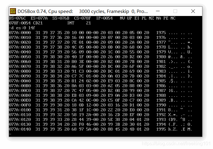assume cs:codesg,ds:datadata segmentdb '1975','1976','1977','1978','1979','1980','1981','1982','1983'db '1984','1985','1986','1987','1988','1989','1990','1991','1992'db '1993','1994','1995';84字节。总共 21 个年份,一个年份4个字节,总共 84 字节dd 16,22,382,1356,2390,8000,16000,24486,50065,97479,140417,197514dd 345980,590827,803530,1183000,1843000,2759000,3753000,4649000,5937000;84字节dw 3,7,9,13,28,38,130,220,476,778,1001,1442,2258,2793,4037,5635,8226dw 11542,14430,15257,17800;通过计算得到每一个代码段相对于起始的偏移量