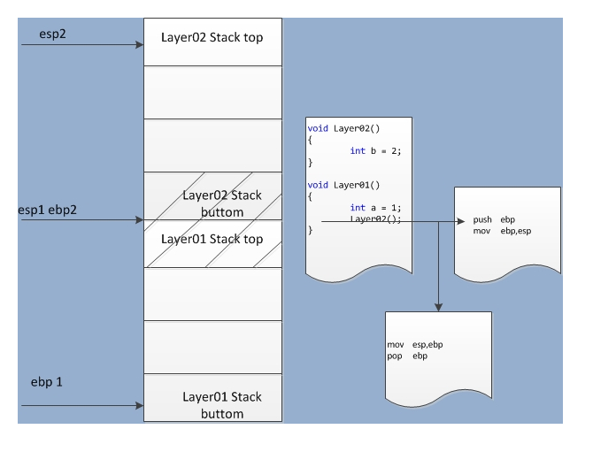 开始两行代码的意思是先将ebp1压栈,然后将现在的栈顶esp1作为函数调用时的栈底,所以会执行如下语句: