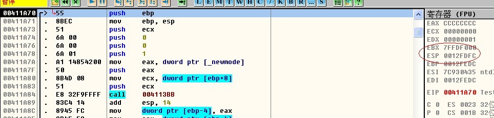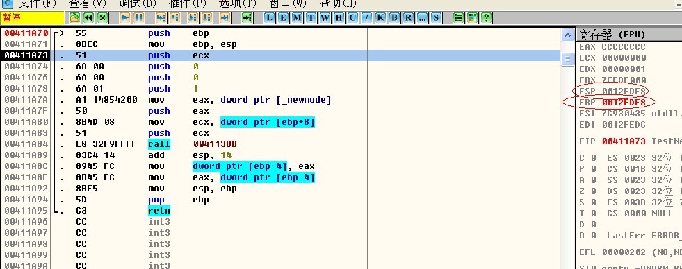 可以看到前两句已经执行了,那么ebp跟esp的值也发生了变化。esp=0012FDF8,ebp=0012FDF8。为神马?一句句解读,push ebp,向栈里面压入了一个东西,那么栈顶此时应该发生变化了,也就是 地址-4字节。为什吗是减法呢?因为是向低地址增长的,这点一定得注意。所以此时esp变化成了0012FDFC-4=OO12FDF8.至于ebp也等于0012FDF8就不解释了。