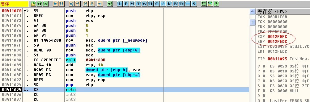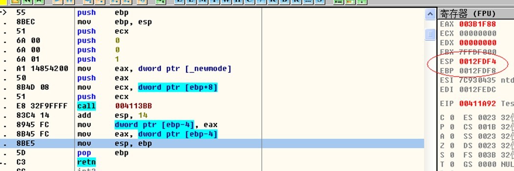 此时呢,观察现在的值。栈顶esp=0012FDF4,而ebp=0012FDF8;没啥好说的,此时的栈顶已经又跑上去了,说明又有元素压栈了。那么执行这句mov esp,ebp之后,不用说,esp跟ebp都会变成0012FDF8.我们重点看下一幅,执行完pop,让ebp出栈,后会发生神马。