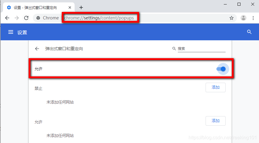 或者 chrome -》设置 -》高级 -》隐私设置和安全性 -》网站设置 -》弹出式窗口和重定向,也可以设置。