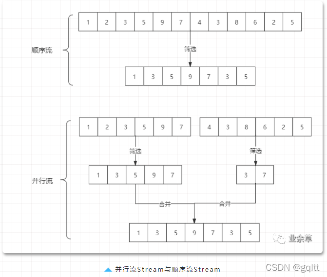 「stream和parallelStream的简单区分:」 stream是顺序流,由主线程按顺序对流执行操作,而parallelStream是并行流,内部以多线程并行执行的方式对流进行操作,但前提是流中的数据处理没有顺序要求。例如筛选集合中的奇数,两者的处理不同之处: