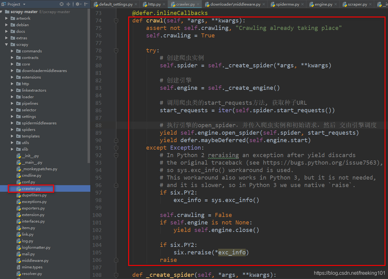 我们来看 Cralwer 的 crawl 方法:(scrapy/crawler.py)