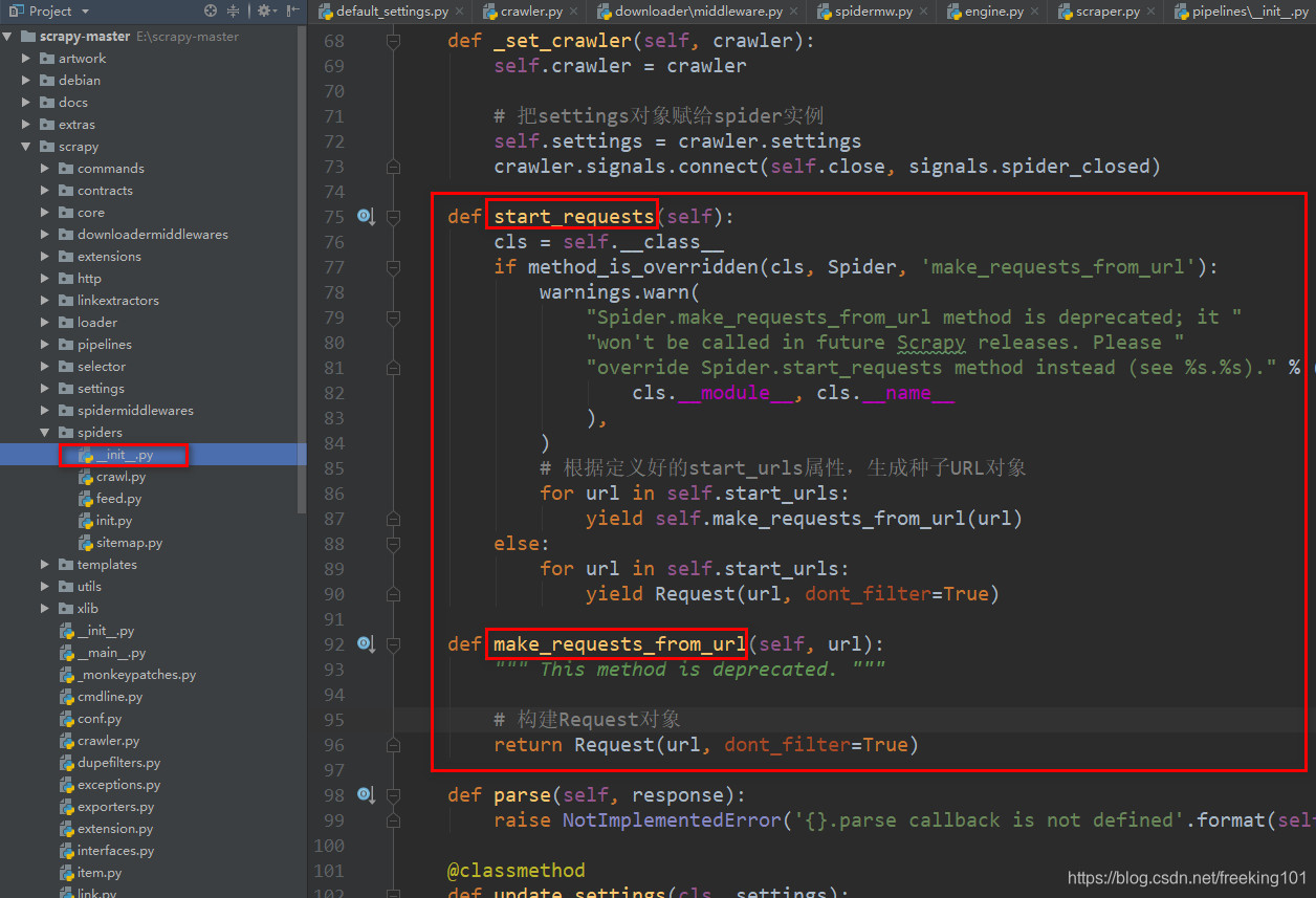 在把控制权交给引擎调度之前,先创建出爬虫实例,然后创建引擎实例(此过程见Scrapy源码分析(三)核心组件初始化),然后调用了spider的start_requests方法,这个方法就是我们平时写的最多爬虫类的父类,它在spiders/__init__.py中: