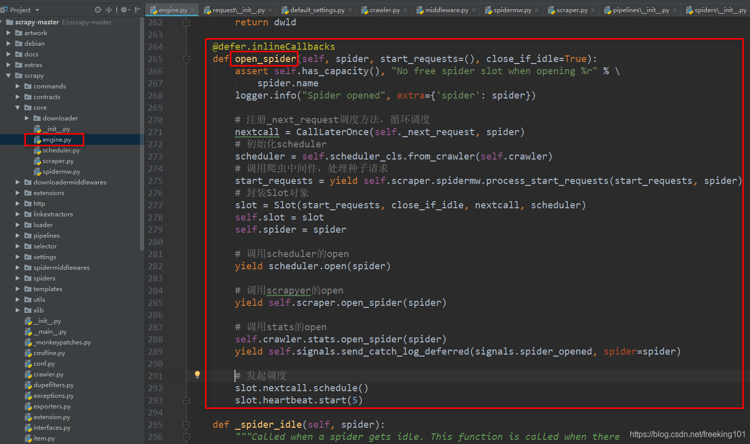 回到crawl方法,构建好种子请求对象后,调用了engine的open_spider方法: