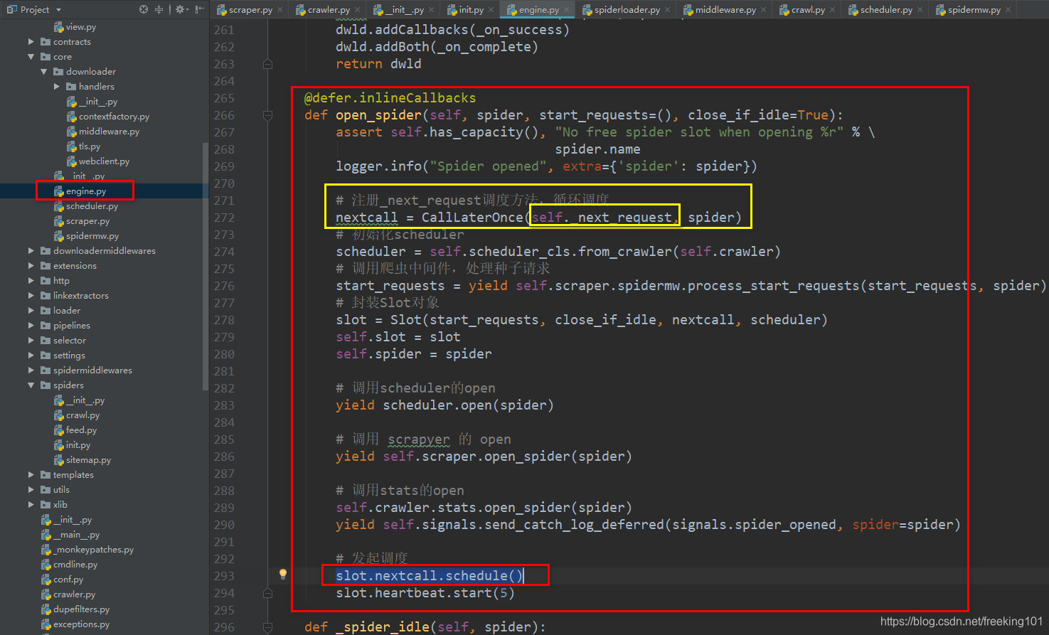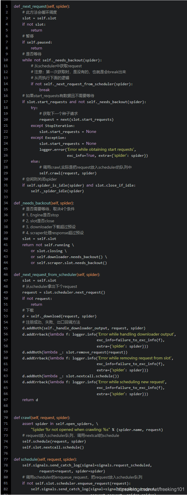 这里封装了循环执行的方法类,并且注册的方法会在 twisted 的 reactor 中异步执行,以后执行只需调用 schedule 方法,就会注册 self 到 reactor 的 callLater 中,然后它会执行 __call__ 方法,进而执行我们注册的方法。而这里我们注册的方法是引擎的_next_request,也就是说,此方法会循环调度,直到程序退出。