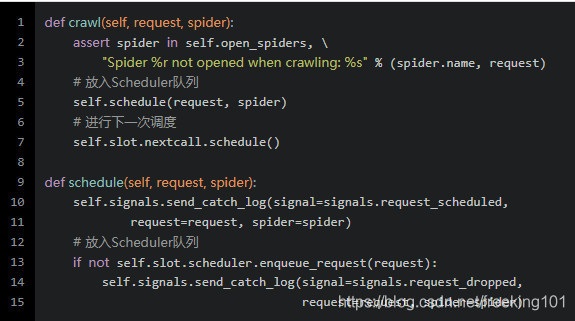这里要注意,在第一次调用此方法时,Scheduler 中是没有放入任何 Request 的,这里会直接 break 出来,执行下面的逻辑,而下面就会调用 crawl 方法,实际是把请求放到 Scheduler 的请求队列,放入队列的过程会经过 请求过滤器 校验是否重复。