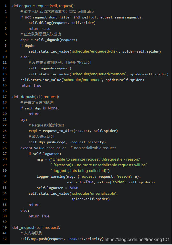 Scheduler 请求入队方法:(scrapy/core/schedulter.py)
