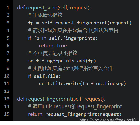 在入队之前,首先通过请求指纹过滤器检查请求是否重复,也就是调用了过滤器的request_seen: