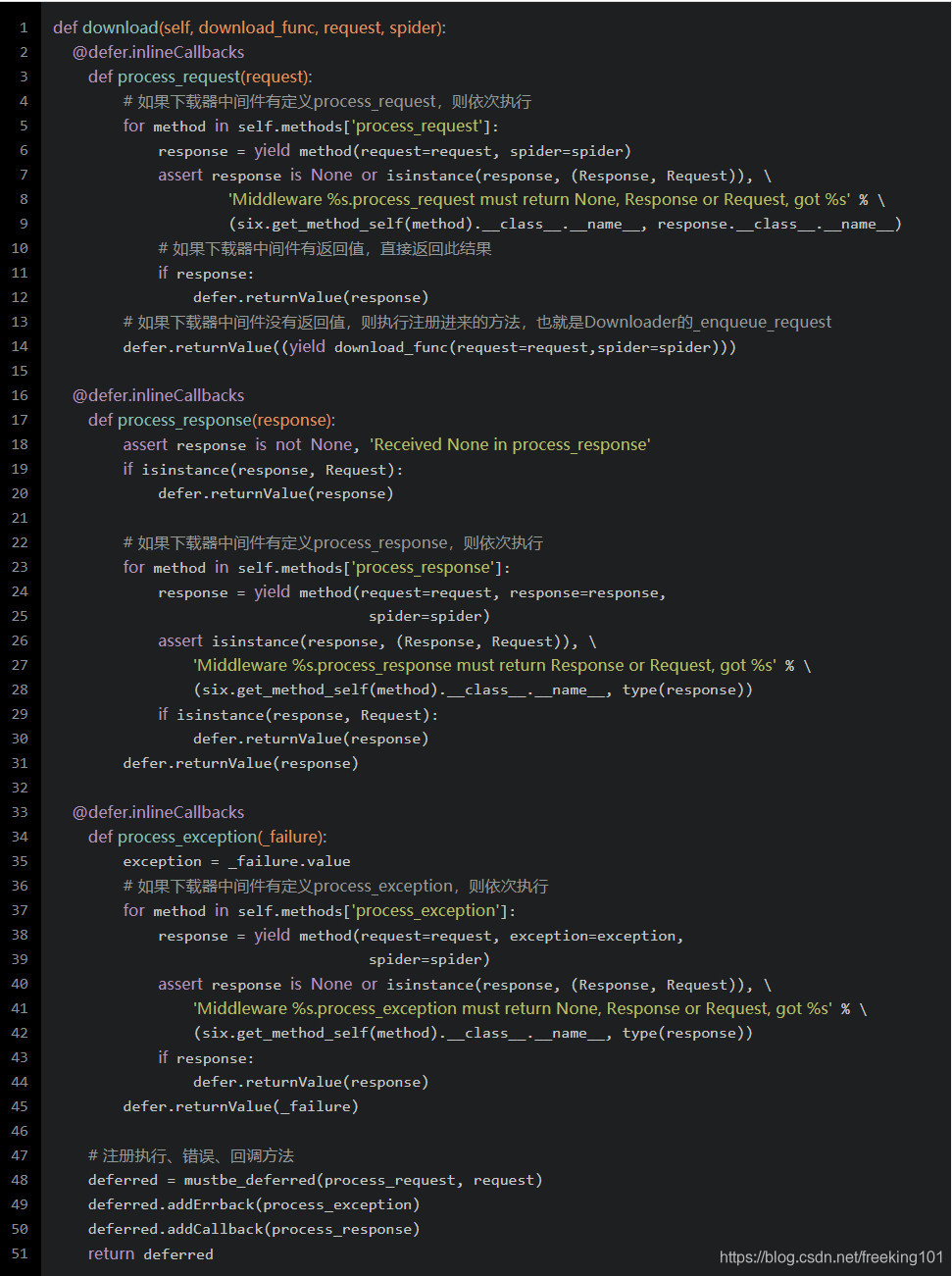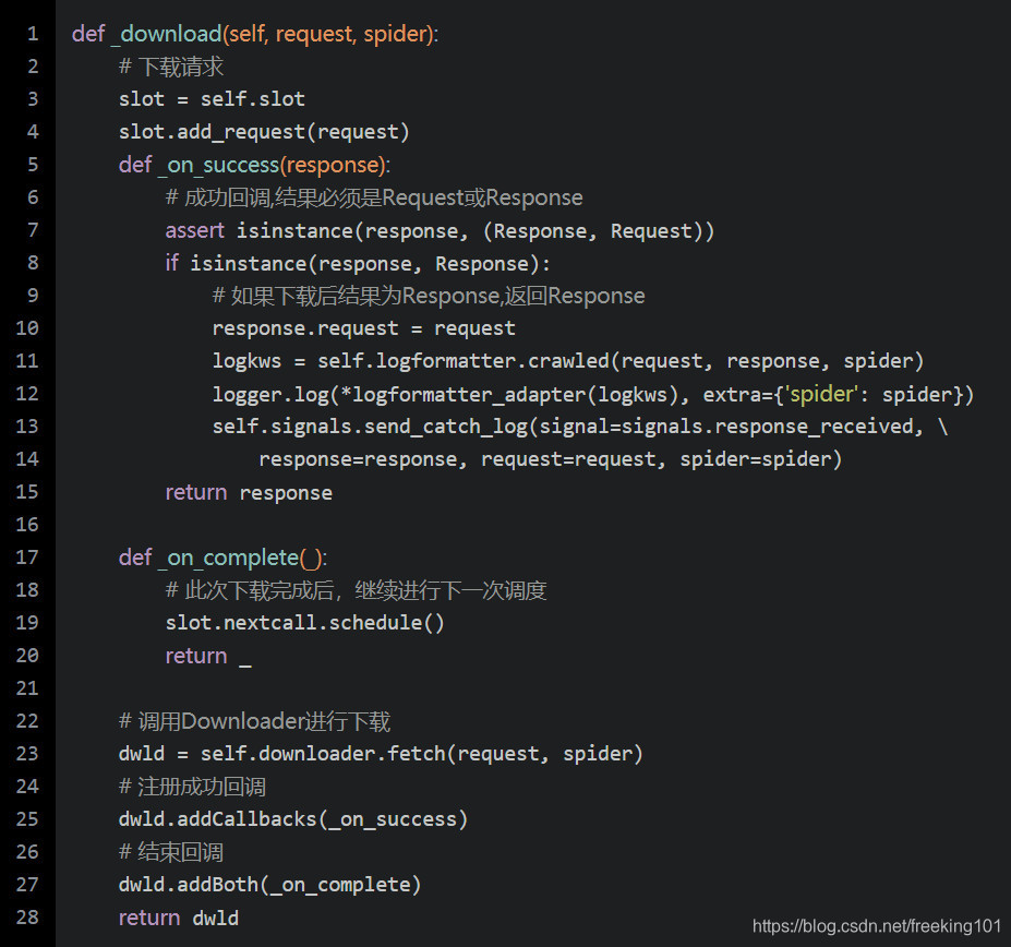 这里调用下载器中间件的download方法 (scrapy/core/downloader/middleware.py),并注册下载成功的回调方法是_enqueue_request,来看下载方法: