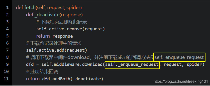 在进行网络下载时,调用了Downloader的fetch:(scrapy/core/downloader/__init__.py)