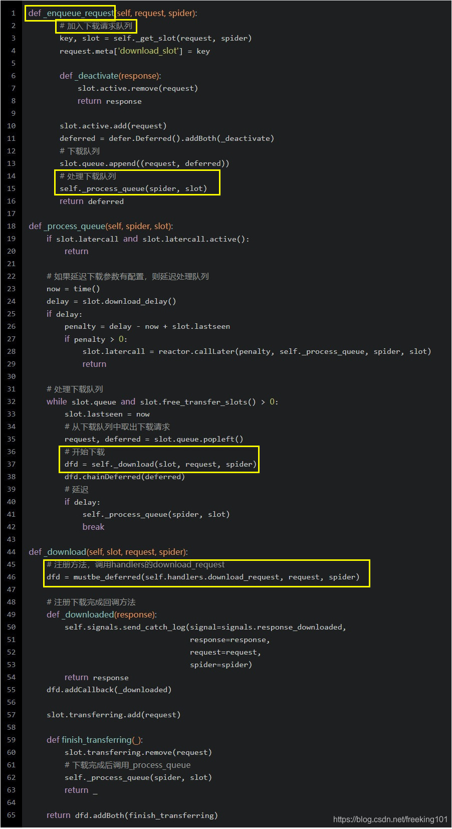 在这里,也维护了一个下载队列,可根据配置达到延迟下载的要求。真正发起下载请求的是调用了self.handlers.download_request:(scrapy/core/downloader/handlers/__init__.py)
