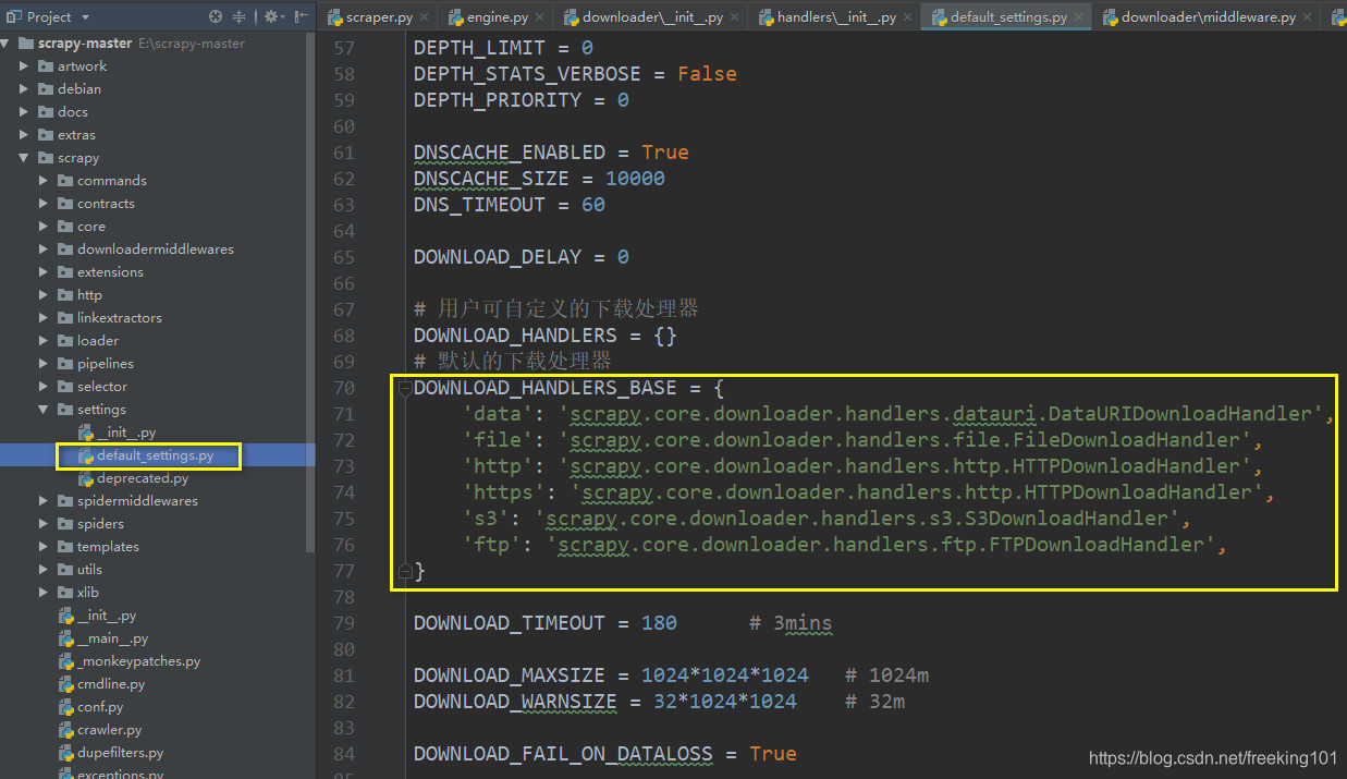 下载前,先通过解析request的scheme来获取对应的下载处理器,默认配置文件中定义的下载处理器: