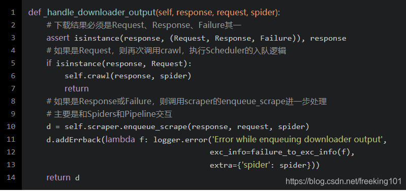 拿到最终的下载结果后,再回到 ExecuteEngine 的 _next_request_from_scheduler 方法,会看到调用了_handle_downloader_output 方法,也就是处理下载结果的逻辑: