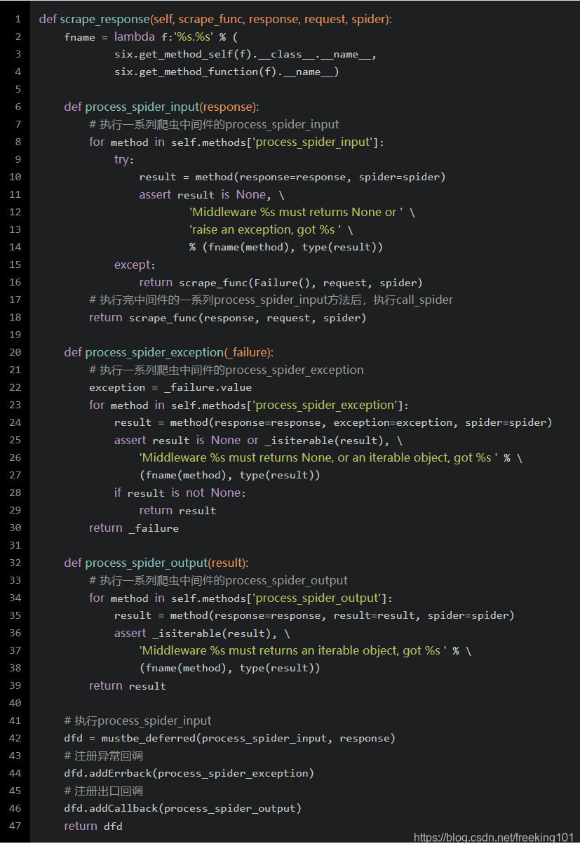 首先加入到Scraper的处理队列中,然后从队列中获取到任务,如果不是异常结果,则调用 爬虫中间件管理器 的 scrape_response 方法: