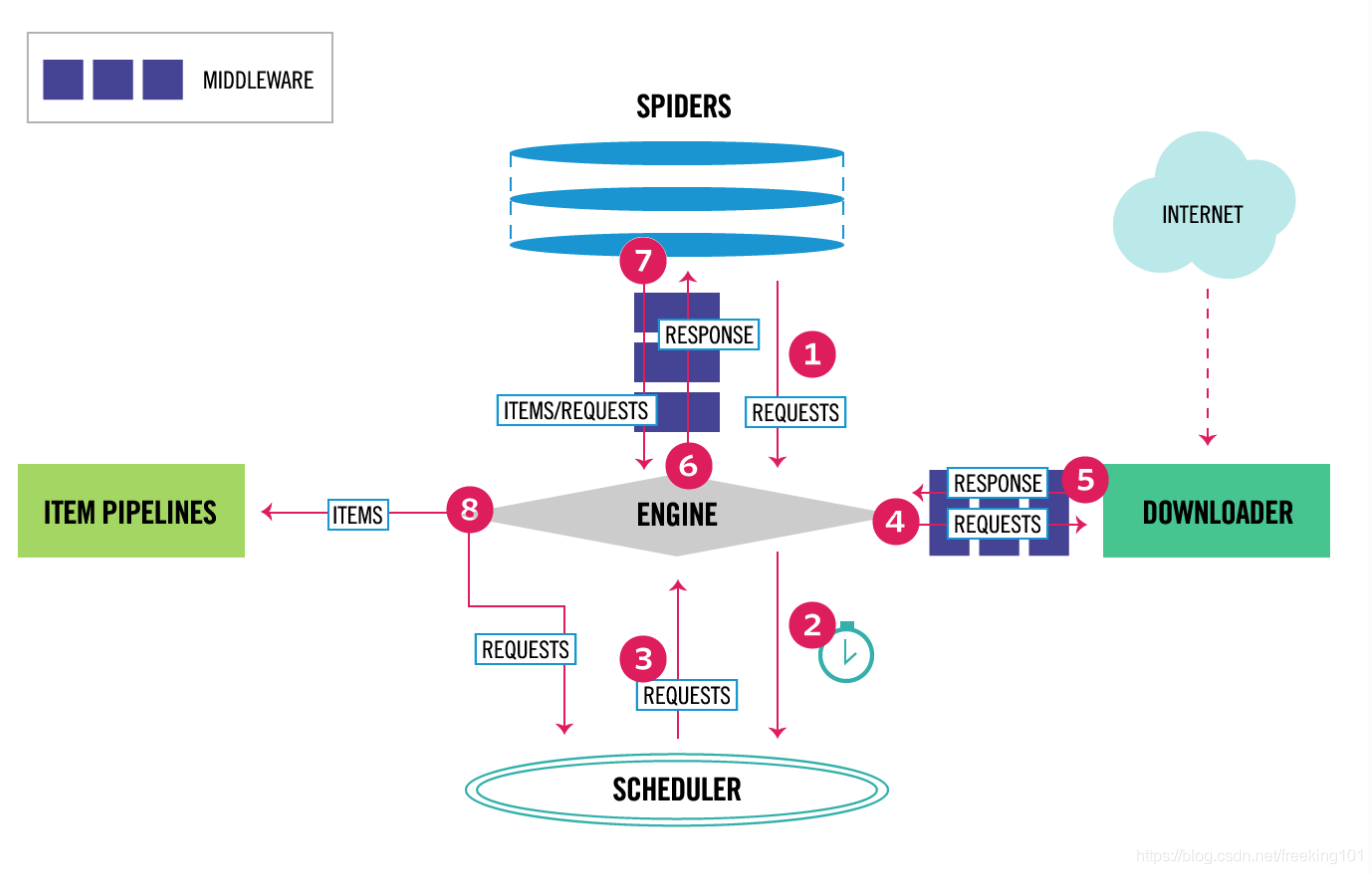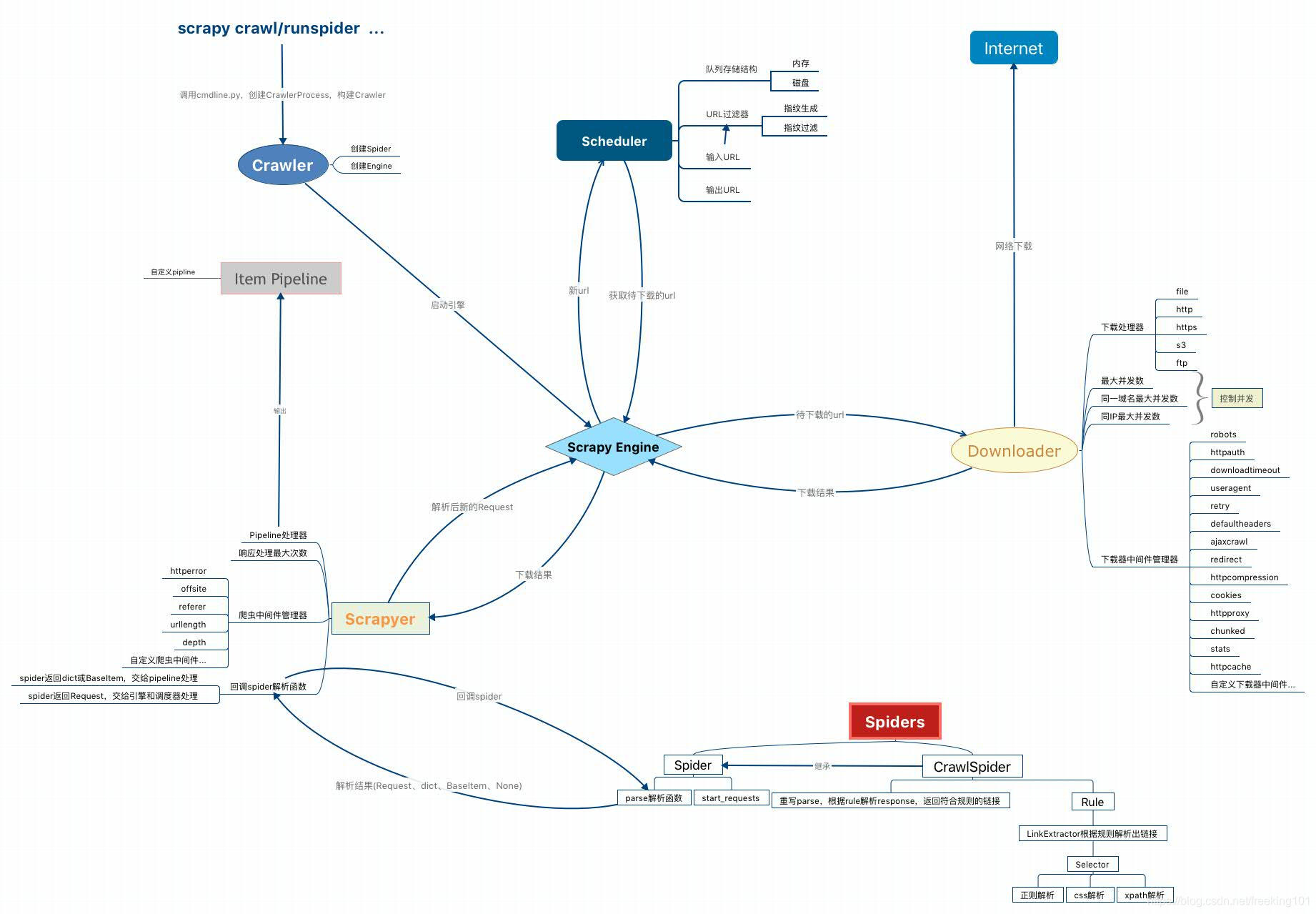 Scrapyer 主要是与 Spider 模块和 Pipeline 模块进行交互。