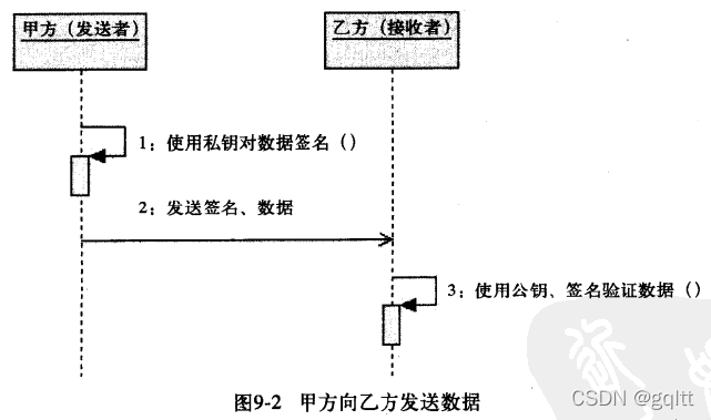 甲方向乙方发送数据时需要附加签名,数据与签名形成一则消息发送给接收者。