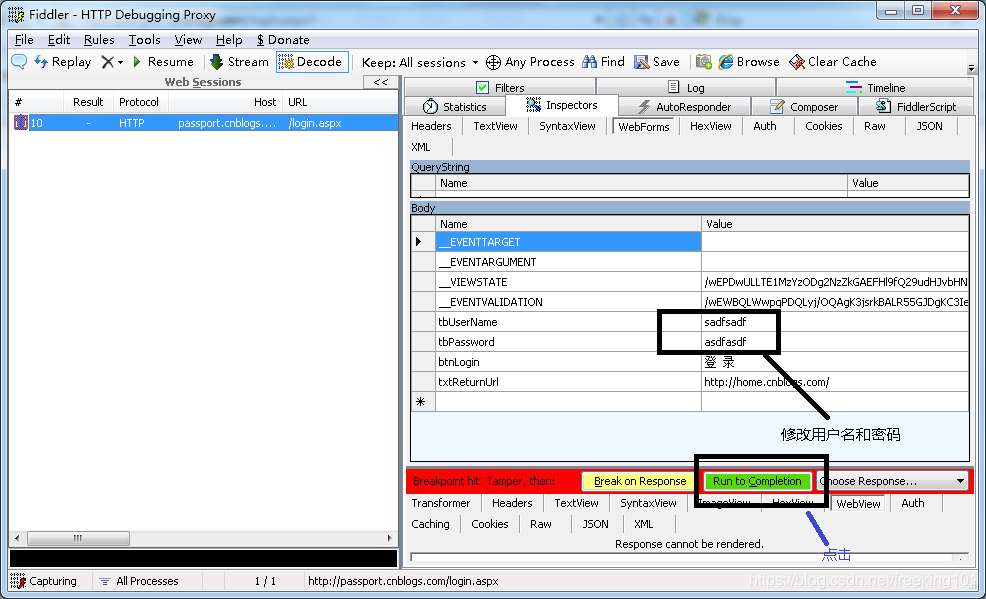 - 4. Fiddler 能中断这次会话,选择被中断的会话,点击Inspectors tab下的WebForms tab 修改用户名密码,然后点击Run to Completion 如下图所示。