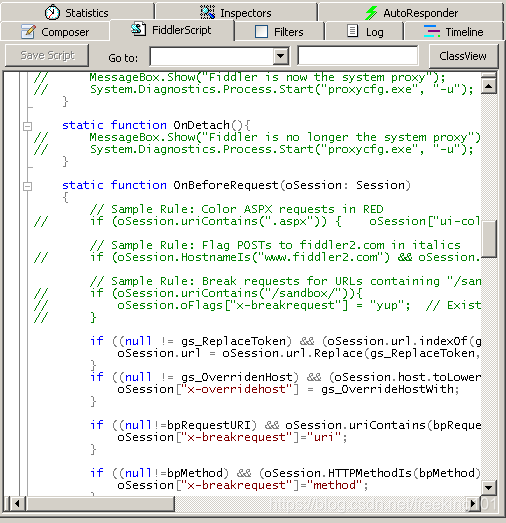 把这段脚本放在 OnBeforeRequest(oSession: Session) 方法下,并且点击 "Save script"
