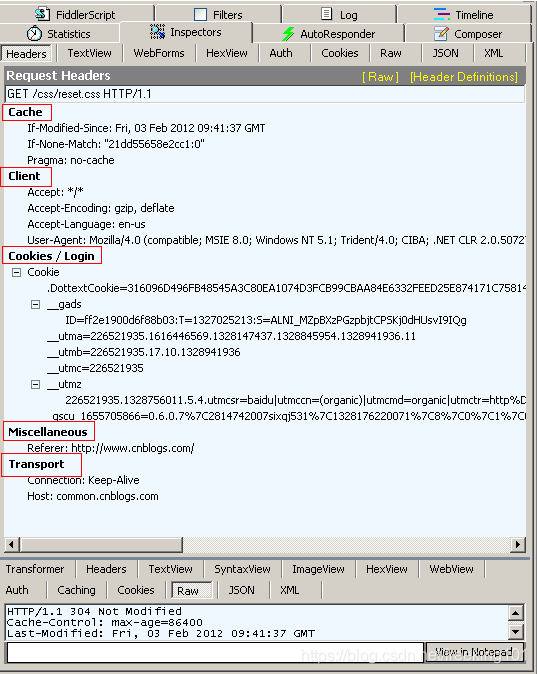 同样使用Fiddler 查看Response header, 点击Inspectors tab ->Response tab-> headers 如下图所示
