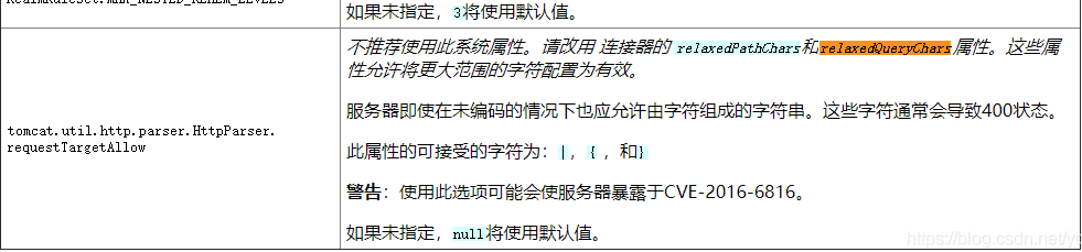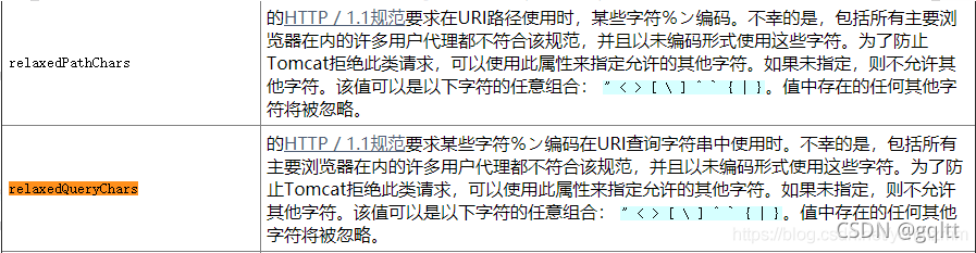 连接器配置relaxedPathChars 和relaxedQueryChars 参考(官方文档)如下: