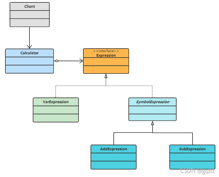 public abstract class SymbolExpression implements Expression {protected Expression left;protected Expression right;public SymbolExpression(final Expression left, final Expression right) {this.left = left;this.right = right;}@Overridepublic abstract int interpreter(Map<String, Integer> var);}AddExpression.java