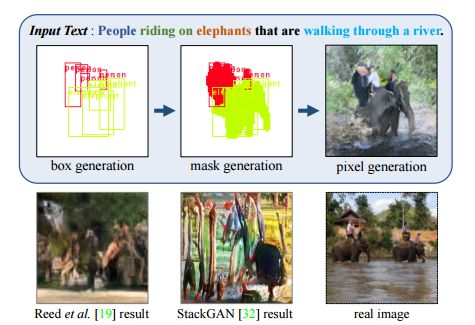 然而,对于现有方法来说,它们的成功主要局限于诸如鸟类和花朵等这些简单的数据集,而像MS-COCO这样复杂的、真实图像的生成,对于它们来说仍然是一个很大的、公开性的挑战。如图1所示,从“人们骑在大象身上穿过一条河(people riding on elephants that are walking through a river)”这样的通用句子中生成图像,需要对各种视觉概念进行多种推理,诸如目标类别(人和大象)、目标的空间配置(骑着),场景环境(穿过一条河流)等等,这远比在较简单的数据集中生成单一的、大型的目标要复杂得多。现有的方法在为这种复杂的文本描述生成合理的图像方面还没有取得成功,因为从通用图像中学习一个文本到像素的直接映射是非常复杂的。