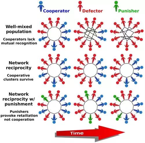 行为决策演化示意图。最上面一行是混合群体,下面两行是网络群体。相比于混合群体,网络促使合作者聚集成团簇,但是惩罚的加入将破坏合作环境。