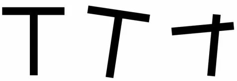在上述图像中,这三个形状中的每一个都是相同的两个不变概念的排列。前两个我们可以识别为大写字母T,但第三个显然不是——即使它包含相同的部分。这告诉我们,不仅仅是定义一个对象的部分存在,还有它们之间的关系。第二个T仍然看起来像T,因为这两个部分仍然互相连接在同一个位置上,并且旋转到同一个程度。第三个不像T,因为各部分现在有不同的关系——它们以相反的方向旋转,并且加入到不同的相对位置上。