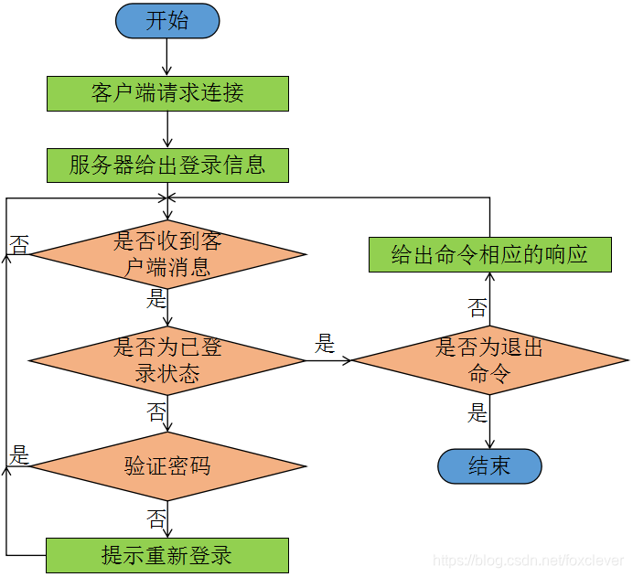 我们要实现的这个Telnet服务器是比较简单的一个设计。当客户端成功链接到服务器后,服务器就会提示用户登录,成功登陆后就可以向服务器发送命令,当发送不同的命令时,服务器给出不同的响应。具体的操作流程设计如下: