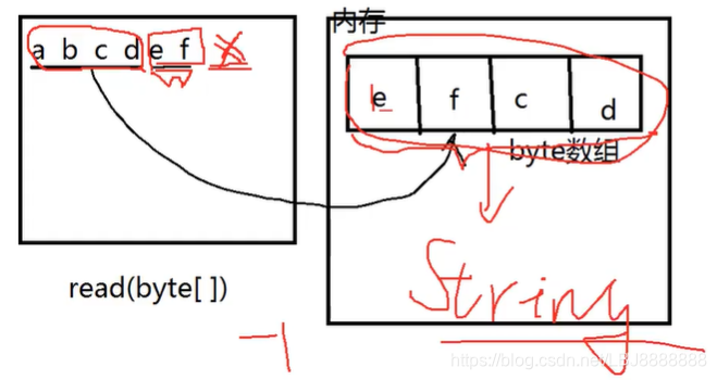 package com.lbj.javase.io;import java.io.FileInputStream; import java.io.FileNotFoundException; import java.io.IOException;public class FileInputStreamTest02 {public static void main(String[] args) {FileInputStream f=null;try {//123.txt存储的是abcdeff=new FileInputStream("D:\\2021-2022课件\\123.txt");//定义一个byte数组,此数组一次可以存储4个字节byte[] b=new byte[4];//与read()的不同之处在于取的不是“字节”本身,而是 数量//第一次读int readData2=f.read(b);System.out.println(readData2);//4//原则:需要将‘读’的字节数组‘全部’转换成字符串类型输出System.out.println(new String(b));//abcd//实际上:需要将‘读’的字节数组‘部分’读多少转换多少System.out.println(new String(b,0,readData2));//abcd//第二次读int readData3=f.read(b);System.out.println(readData3);//2System.out.println(new String(b));//efcd//读多少转换多少System.out.println(new String(b,0,readData3));//ef//第三次读//读不到任何数据的时候返回-1int readData4=f.read(b);System.out.println(readData4);//-1//循环输出读取的数据int readData=0;while ((readData=f.read())!=-1){System.out.println(readData);}} catch (FileNotFoundException e) {e.printStackTrace();} catch (IOException e) {e.printStackTrace();} finally {if (f!=null){try {f.close();} catch (IOException e) {e.printStackTrace();}}}} }示意图: