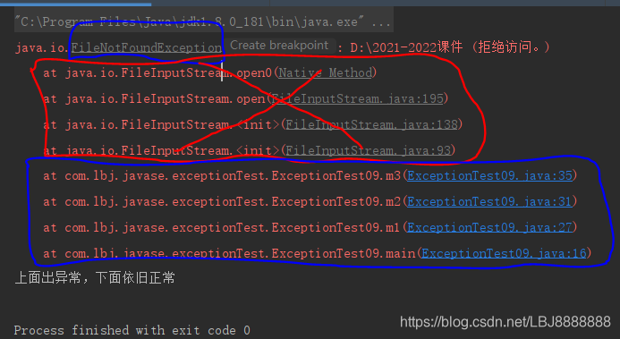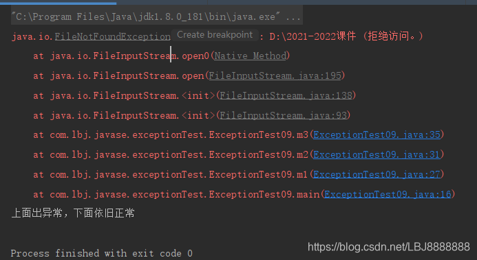 import java.io.FileNotFoundException;public class ExceptionTest10 {public static void main(String[] args) {try {m1();} catch (FileNotFoundException e) {//获取异常的简单描述信息String msg=e.getMessage();System.out.println(msg);}//如果这里是一段正常的代码,那么上一段代码不会影响到下面的代码,这就是try--catch的好处System.out.println("上面出异常,下面依旧正常");}private static void m1() throws FileNotFoundException {m2();}private static void m2() throws FileNotFoundException {m3();}private static void m3() throws FileNotFoundException {new FileInputStream("D:\\2021-2022课件");}