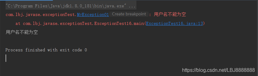 package com.lbj.javase.exceptionTest;public class ExceptionTest16 {public static void main(String[] args) {//创建异常对象(只是new了异常对象,并没有手动抛出)MyException01 e=new MyException01("用户名不能为空");//打印异常堆栈信息e.printStackTrace();//获取异常简单描述信息String msg= e.getMessage();System.out.println(msg);}}