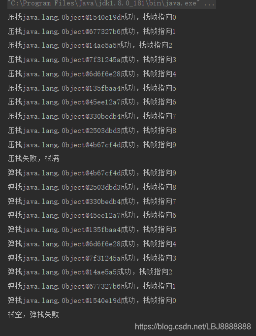public class MyStackTest01 {public static void main(String[] args) {//new 是把构造方法实例化//也就是意味着 创建一个栈对象,初始化容量是10个ArrayTest10 arrayTest10=new ArrayTest10();//调用方法压栈try {arrayTest10.push(new Object());arrayTest10.push(new Object());arrayTest10.push(new Object());arrayTest10.push(new Object());arrayTest10.push(new Object());arrayTest10.push(new Object());arrayTest10.push(new Object());arrayTest10.push(new Object());arrayTest10.push(new Object());arrayTest10.push(new Object());//最后压入的,最先弹出来//压到这个元素的时候失败了arrayTest10.push(new Object());} catch (MyStackOperationException e) {//输出简单的异常信息System.out.println(e.getMessage());}//调用方法弹栈//弹栈顾名思义我们需要获取些什么//Object ele=arrayTest10.pop();try {arrayTest10.pop();arrayTest10.pop();arrayTest10.pop();arrayTest10.pop();arrayTest10.pop();arrayTest10.pop();arrayTest10.pop();arrayTest10.pop();arrayTest10.pop();arrayTest10.pop();//弹出的时候,此时栈空了arrayTest10.pop();} catch (MyStackOperationException e) {//输出简单的异常信息System.out.println(e.getMessage());}}