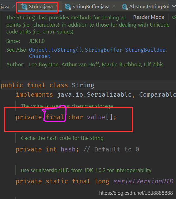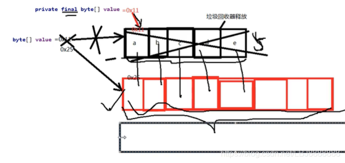 在String类中底层代码其实是字符类型的数组char[] ,另外,用final修饰,也就意味着,String在直接创建的时候,根据其底层是final修饰的数组这个前提下,我们得知,一旦创建,其长度和内存地址不会发生改变
