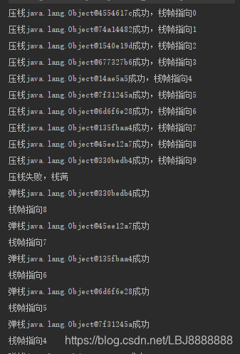 public class MyStackTest01 {public static void main(String[] args) {//new 是把构造方法实例化//也就是意味着 创建一个栈对象,初始化容量是10个ArrayTest10 arrayTest10=new ArrayTest10();//调用方法压栈arrayTest10.push(new Object());arrayTest10.push(new Object());arrayTest10.push(new Object());arrayTest10.push(new Object());arrayTest10.push(new Object());arrayTest10.push(new Object());arrayTest10.push(new Object());arrayTest10.push(new Object());arrayTest10.push(new Object());arrayTest10.push(new Object());//最后压入的,最先弹出来//压到这个元素的时候失败了arrayTest10.push(new Object());//调用方法弹栈//弹栈顾名思义我们需要获取些什么//Object ele=arrayTest10.pop();arrayTest10.pop();arrayTest10.pop();arrayTest10.pop();arrayTest10.pop();arrayTest10.pop();arrayTest10.pop();arrayTest10.pop();arrayTest10.pop();arrayTest10.pop();arrayTest10.pop();//弹出的时候,此时栈空了arrayTest10.pop();}