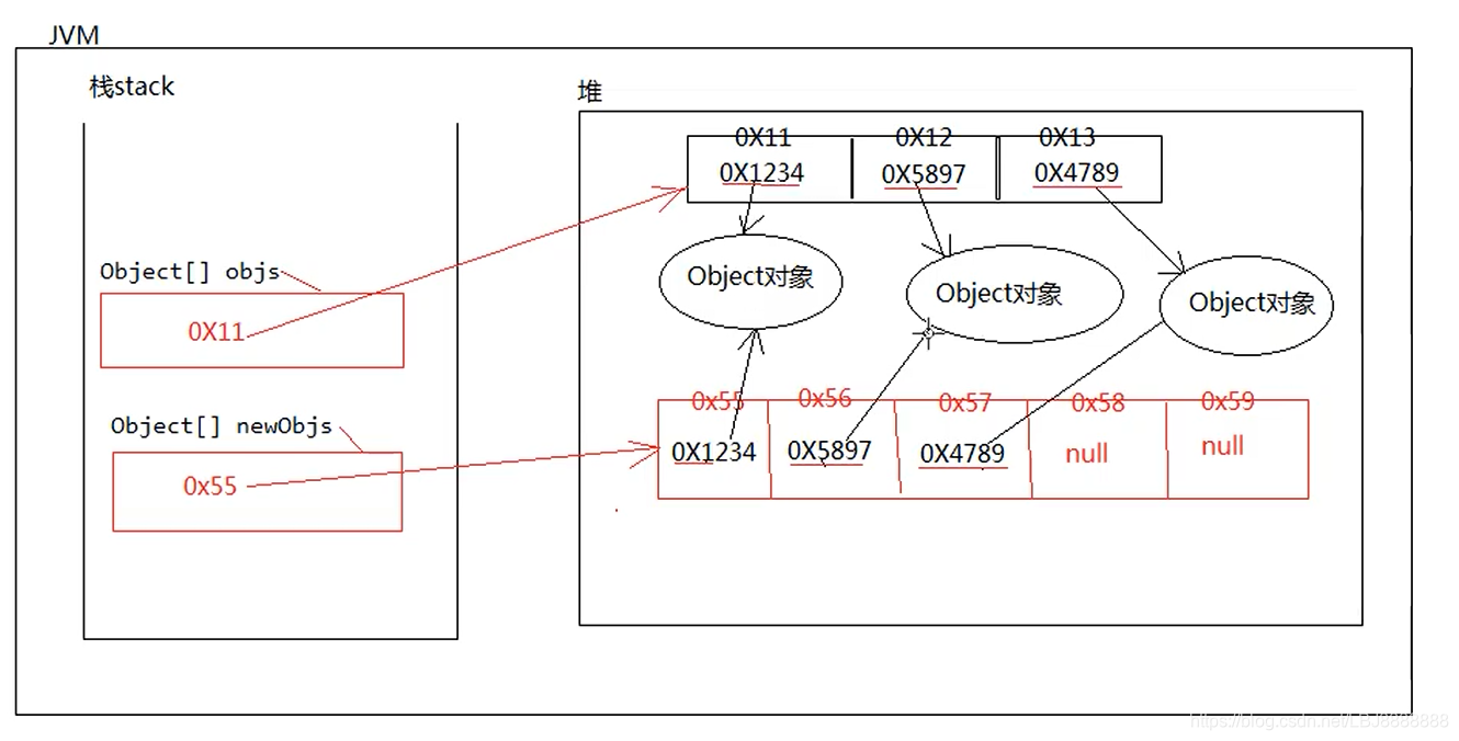 对于数组来书,实际上只能存储java对象的内存地址,数组中存储的每个元素都是“引用”