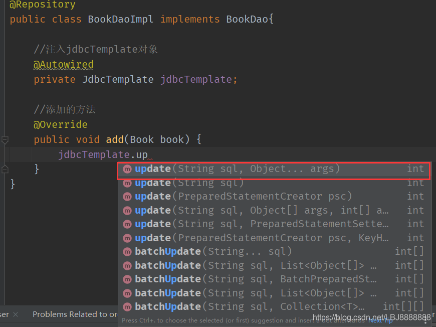 过程其实很简单:其实就是调用jdbcTemplate中的update方法,通过update方法中的两个参数创建sql语句以及参数引入