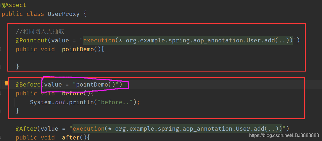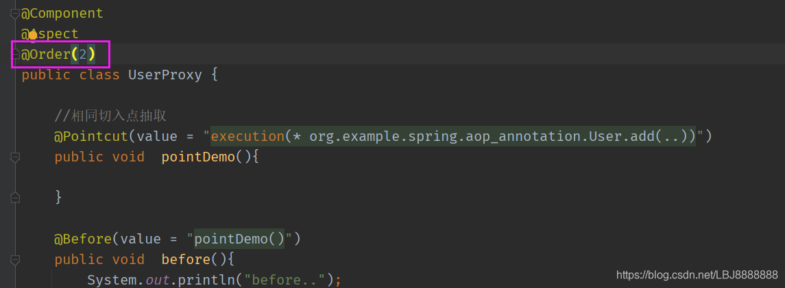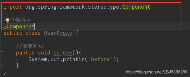 public class UserProxy {//前置通知//@Before注解表示作为前置通知@Before(value = "execution(* com.lbj.spring5.aop_annotation.User.add(..))")public void before(){System.out.println("before");}