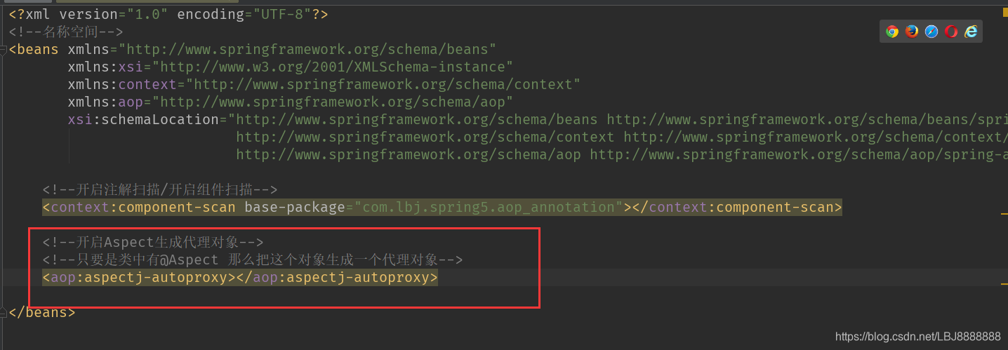 <beans xmlns="http://www.springframework.org/schema/beans"xmlns:xsi="http://www.w3.org/2001/XMLSchema-instance"xmlns:context="http://www.springframework.org/schema/context"xmlns:aop="http://www.springframework.org/schema/aop"xsi:schemaLocation="http://www.springframework.org/schema/beans http://www.springframework.org/schema/beans/spring-beans.xsdhttp://www.springframework.org/schema/context http://www.springframework.org/schema/context/spring-context.xsdhttp://www.springframework.org/schema/aop http://www.springframework.org/schema/aop/spring-aop.xsd"><!--开启注解扫描/开启组件扫描--><context:component-scan base-package="com.lbj.spring5.aop_annotation"></context:component-scan>