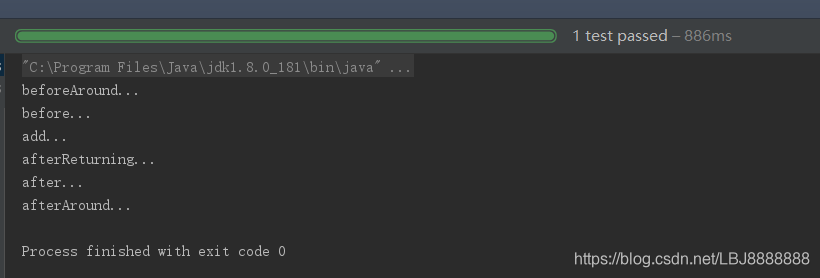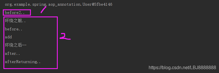 public class TestAop {@Testpublic void testAopAnnotation(){//加载配置文件ApplicationContext context=new ClassPathXmlApplicationContext("bean1.xml");//得到对象,引入依赖User user = context.getBean("user", User.class);//调用对象的方法user.add();}
