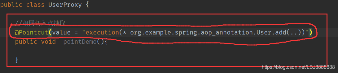 package com.lbj.spring5.aop_annotation;public class User {public void add(){System.out.println("add。。。");}