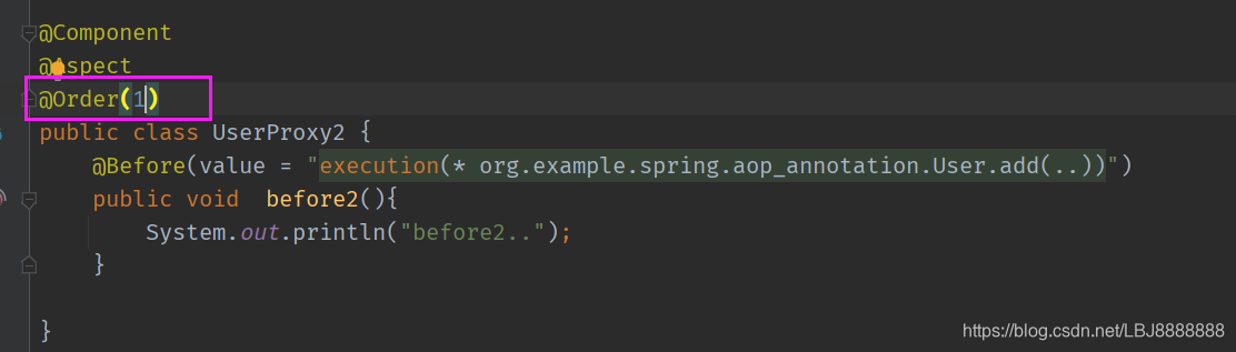 (1)在增强类上面添加注解@Order(数字类型值)