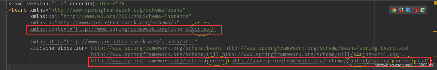 <beans xmlns="http://www.springframework.org/schema/beans"xmlns:xsi="http://www.w3.org/2001/XMLSchema-instance"xmlns:p="http://www.springframework.org/schema/p"xmlns:context="http://www.springframework.org/schema/context"xmlns:util="http://www.springframework.org/schema/util"xsi:schemaLocation="http://www.springframework.org/schema/beans http://www.springframework.org/schema/beans/spring-beans.xsdhttp://www.springframework.org/schema/util http://www.springframework.org/schema/util/spring-util.xsdhttp://www.springframework.org/schema/context http://www.springframework.org/schema/context/spring-context.xsd"><!--从本地location 引入外部属性文件--><context:property-placeholder location="classpath:jdbc.properties"/><!--配置连接池--><bean id="dataSource" class="com.alibaba.druid.pool.DruidDataSource"><!--不是固定值:代表驱动名称 通过表示式从文件中--><property name="driverClassName" value="¥{prop.driverClass}"></property><!--不是固定值:数据库的地址 jdbc:mysql://localhost:3306 名字 userDb--><property name="url" value="¥{prop.url}"></property><!--不是固定值:登录用户名和密码--><property name="username" value="¥{prop.userName}"></property><property name="password" value="¥{prop.password}"></property></bean></beans>