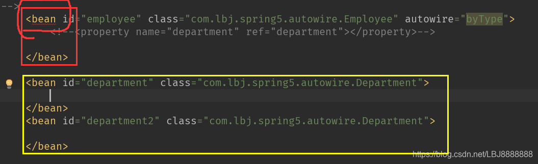--><bean id="employee" class="com.lbj.spring5.autowire.Employee" autowire="byName"><!--<property name="department" ref="department"></property>--></bean><bean id="department" class="com.lbj.spring5.autowire.Department"></bean></beans>
