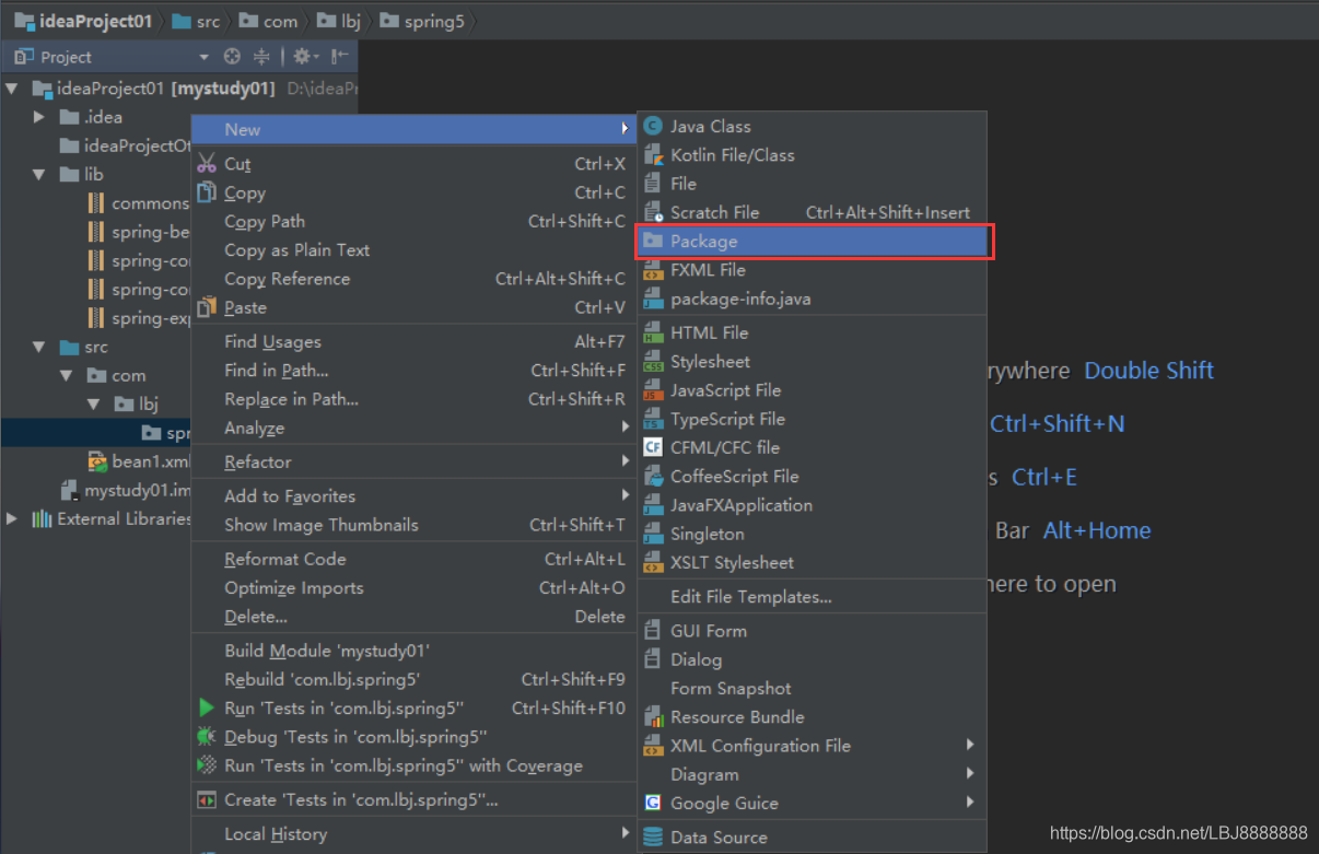 在 testdemo包 新建一个 TestSpring5Demo1类