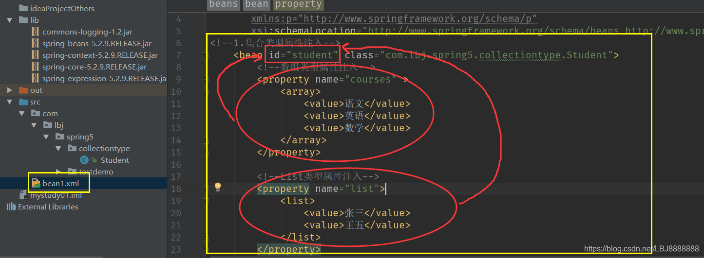 <beans xmlns="http://www.springframework.org/schema/beans"xmlns:xsi="http://www.w3.org/2001/XMLSchema-instance"xmlns:p="http://www.springframework.org/schema/p"xsi:schemaLocation="http://www.springframework.org/schema/beans http://www.springframework.org/schema/beans/spring-beans.xsd"><!--条件:注入的是List集合类型,值是对象的时候--><property name="courseList"><list><!--引入对象的id值--><ref bean="course1"></ref><ref bean="course2"></ref></list></property></bean><!--操作:创建多个course对象--><!--写入第一个课程--><bean id="course1" class="com.lbj.spring5.collectiontype.Course"><property name="cname" value="英语"></property></bean><!--写入第二个课程--><bean id="course2" class="com.lbj.spring5.collectiontype.Course"><property name="cname" value="数学"></property></bean>