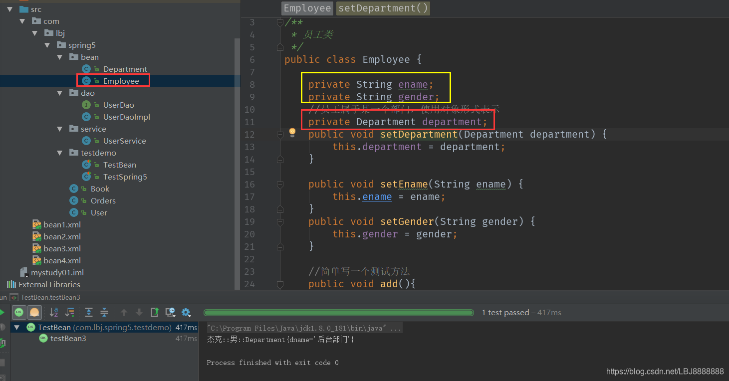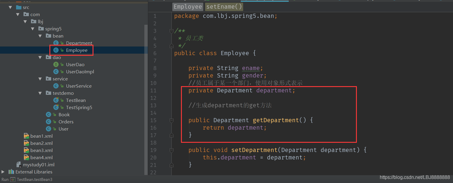而且,因为上面的员工类和部门类 存在内部类的关系,接下来我们就在xml文件中实现 注入内部 bean