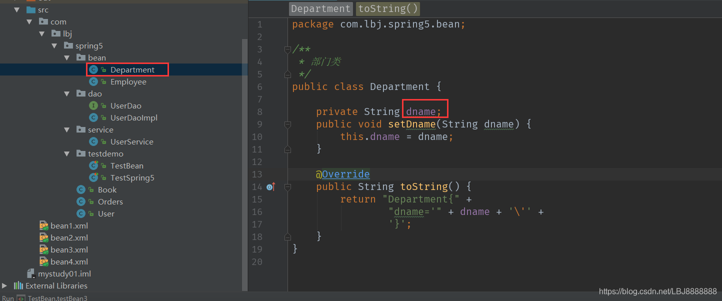 public class Department {private String dname;public void setDname(String dname) {this.dname = dname;}@Overridepublic String toString() {return "Department{" +"dname='" + dname + '\'' +'}';}